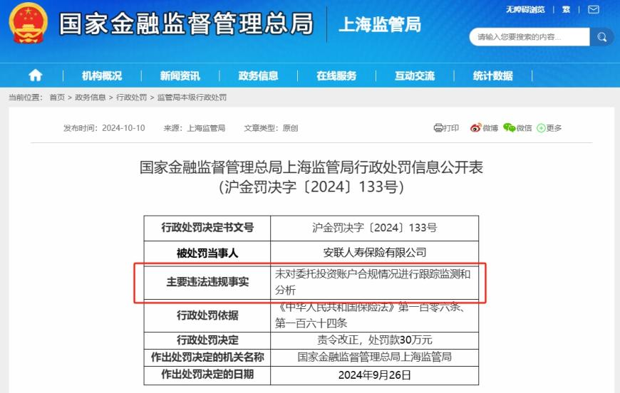 10月10日晚,国家金融监督管理总局网站披露,安联人寿保险有限公司(以下简称“安联人寿”)因涉及“未对委托投资账户合规情况进行跟踪监测和分析”被国家金融监督管理总局上海监管局责令改正,并处罚款30万元。