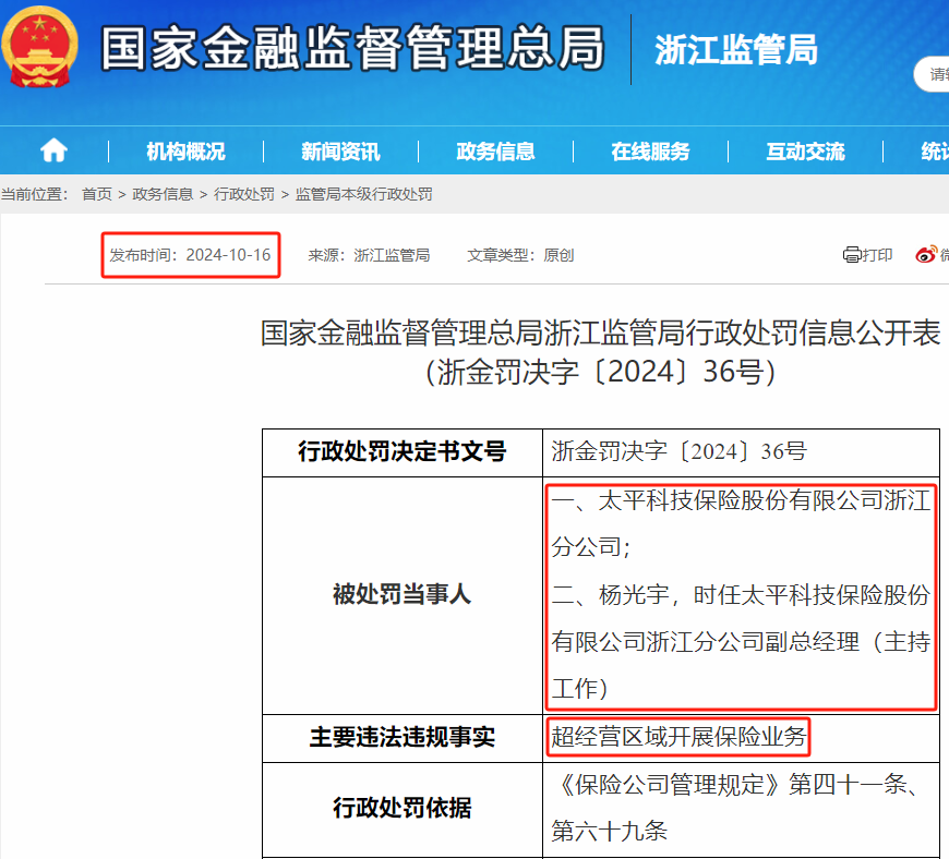 二、2024年10月16日,太平科技保险股份有限公司浙江分公司因“超经营区域开展保险业务”处罚款人民币3万元。