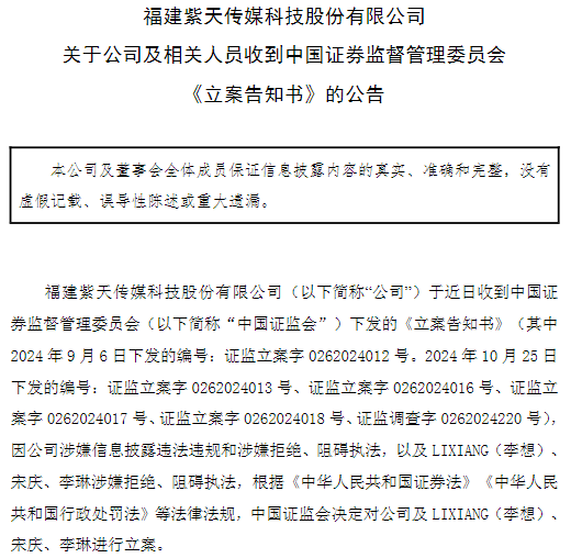 当晚稍晚些时候,深交所对紫天科技下发关注函,披露了该公司被立案调查的相关情况。9月6日,因涉嫌信息披露违法违规,中国证监会依法决定对紫天科技立案调查。10月25日,因涉嫌拒绝阻碍执法,中国证监会依法决定对紫天科技及紫天科技董事长兼董事会秘书宋庆、总经理李琳、财务总监LIXIANG(李想)立案调查。