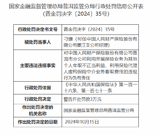 日前,国家金融监督管理总局普洱监管分局行政处罚信息公开表显示,中国人民财产保险股份有限公司普洱市分公司因六项违法违规行为,被罚款91万元。
