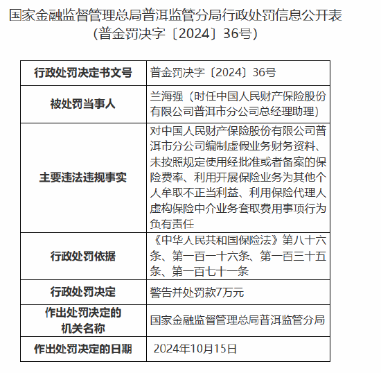 兰海强(时任中国人民财产保险股份有限公司普洱市分公司总经理助理)对中国人民财产保险股份有限公司普洱市分公司编制虚假业务财务资料、未按照规定使用经批准或者备案的保险费率、利用开展保险业务为其他个人牟取不正当利益、利用保险代理人虚构保险中介业务套取费用事项行为负有责任,被警告并罚款7万元。