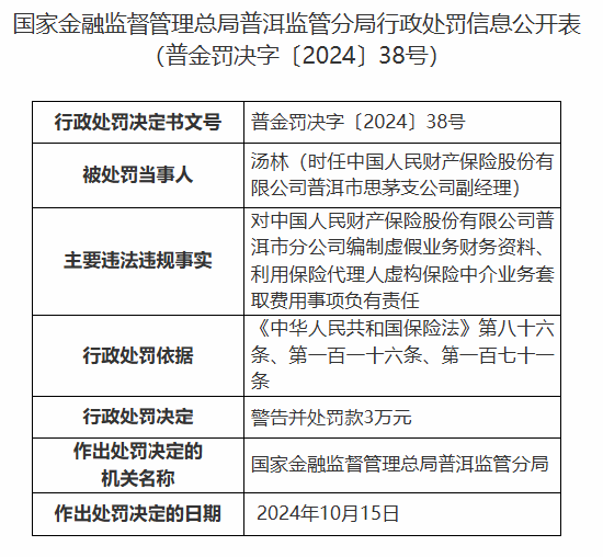 汤林(时任中国人民财产保险股份有限公司普洱市思茅支公司副经理)对中国人民财产保险股份有限公司普洱市分公司编制虚假业务财务资料、利用保险代理人虚构保险中介业务套取费用事项负有责任,被警告并罚款3万元。