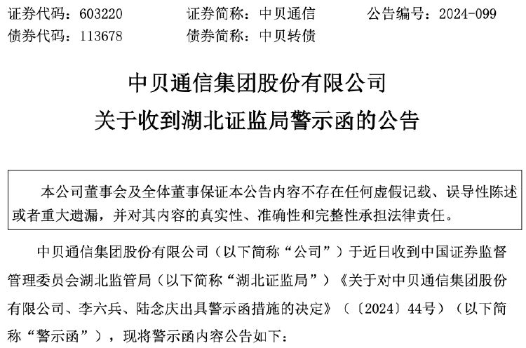 11月7日晚间,中贝通信(603220)公告,近日收到湖北证监局警示函。
