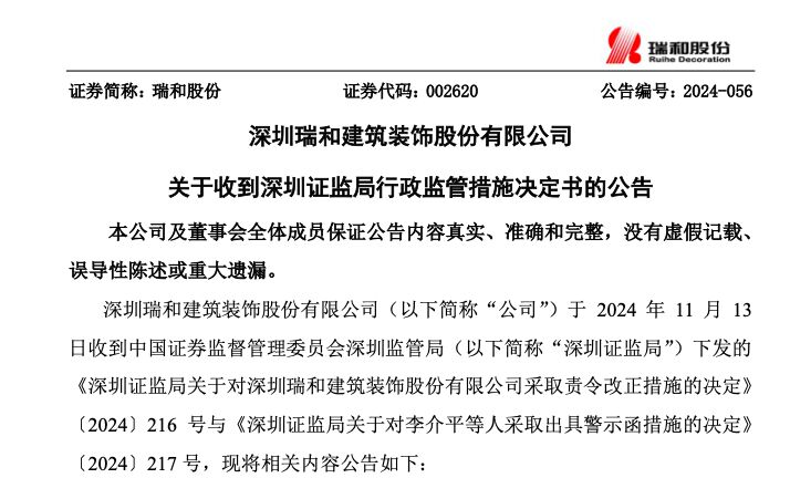 瑞和股份(002620)11月13日晚间公告,公司于2024年11月13日收到深圳证监局下发的两份决定书,因在公司治理、财务会计核算及信息披露方面存在多项不规范情形,深圳证监局决定对公司采取责令改正措施的决定。
