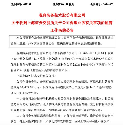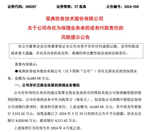 ST观典公告称,公司存在利用自身信用通过签署无商业实质的合同等给其他公司保理融资提供便利的情况,公司在保理业务中作为购货方(债务人),如其他公司到期不能偿还保理公司或银行款项时,需承担付款责任,上述金额为16,083.98万元,其中涉及华夏银行3,552.56万元,该笔金额已于2024年5月29日的相关公告中予以披露;涉及北京银行8,020.00万元,建设银行4,511.42万元。