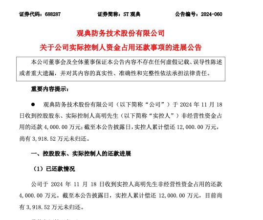 ST观典同日还发布了关于公司实际控制人资金占用还款事项的进展公告。