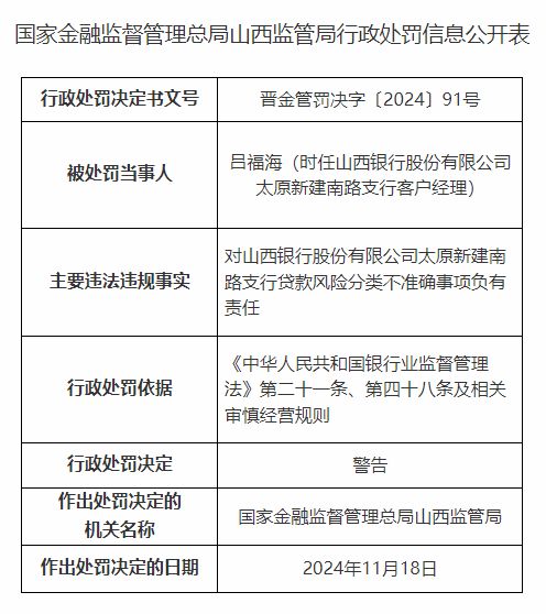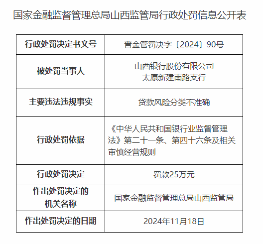 不仅如此,因存在贷款风险分类不准确的问题,山西银行太原新建南路支行同样被罚25万元。上述两张罚单中,山西银行及其支行共被罚215万元。