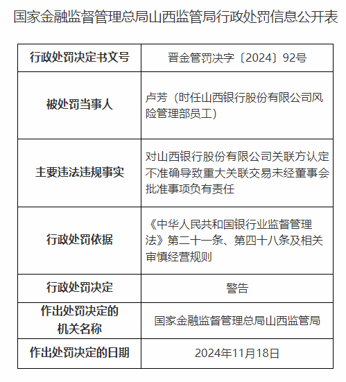此外,因对山西银行上述违法违规行为负有责任,时任山西银行风险管理部员工卢芳、太原分行公司部总经理助理杨晓雅、太原新建南路支行客户经理吕福海均被给予警告。