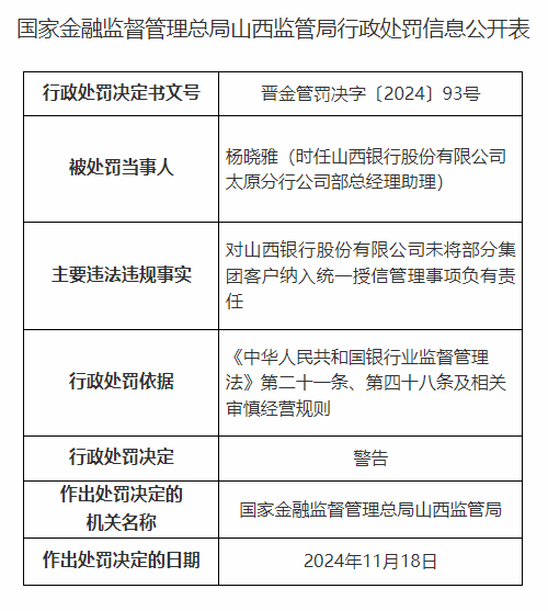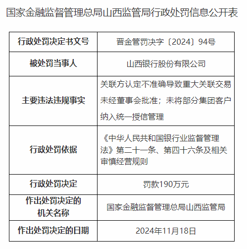 行政处罚信息公开表显示,山西银行存在的主要违法违规事实包括关联方认定不准确导致重大关联交易未经董事会批准、未将部分集团客户纳入统一授信管理。