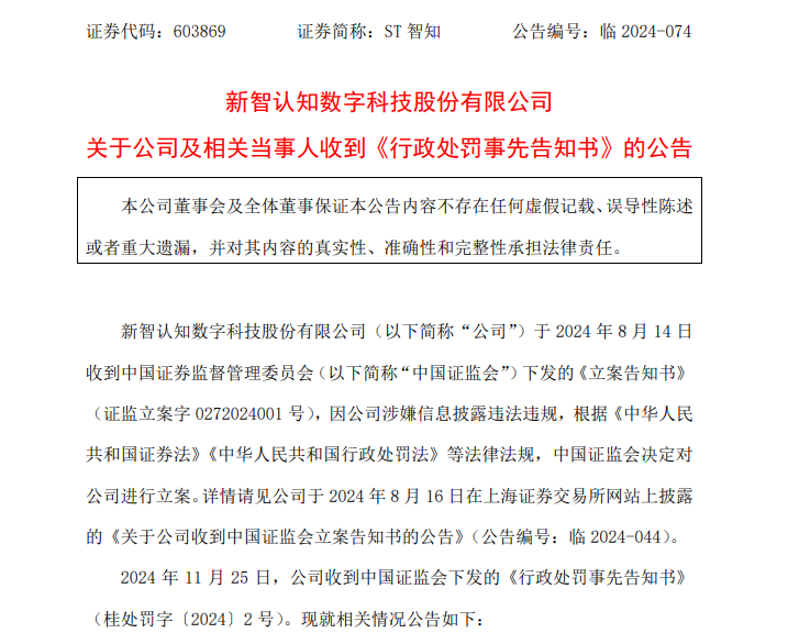 11月26日晚间,新智认知数字科技股份公司(以下简称ST智知)公告,公司及相关当事人收到证监会下发的《行政处罚事先告知书》。因2019年至2021年年度报告存在虚假记载,证监会拟对公司处以850万元罚款,对相关责任人分别警告,并对时任董事长张亚东罚款430万元,对时任董事张滔、董秘兼财务总监张炎锋罚款320万元,对时任总裁杨瑞、时任副总裁谢昕罚款210万元,对副总裁王曦罚款150万元,同时对张亚东采取6年证券市场禁入措施,张滔和张炎锋分别为3年禁入。
