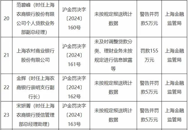 沪金罚决字〔2024〕160号——163号罚单显示,沪农商行因未及时调整贷款分类、理财业务未按规定进行信息披露等,被罚155万元。