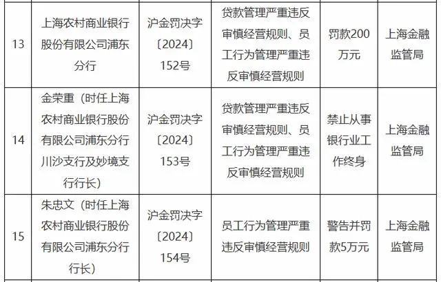 时任沪农商行浦东分行川沙支行及妙境支行行长金荣重终身禁止从事银行业工作;时任沪农商行浦东分行行长朱忠文受到警告,并罚款5万元。
