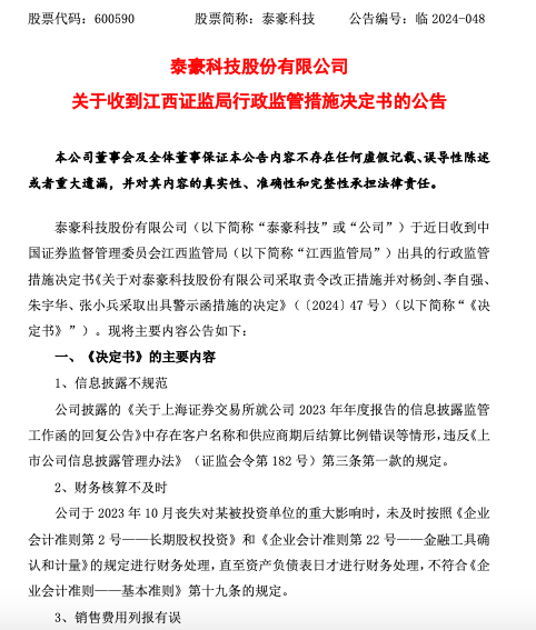 公告称,公司于近日收到中国证券监督管理委员会江西监管局(以下简称“江西证监局”)出具的行政监管措施决定书《关于对泰豪科技股份有限公司采取责令改正措施并对杨剑、李自强、朱宇华、张小兵采取出具警示函措施的决定》(〔2024〕47号)(以下简称“《决定书》”)。