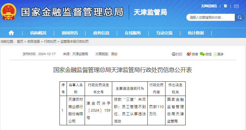 其中,天津农村商业银行股份有限公司因贷款“三查”未尽职以及员工管理不到位、员工从事违法活动等主要违法违规行为,被处以罚款110万元。