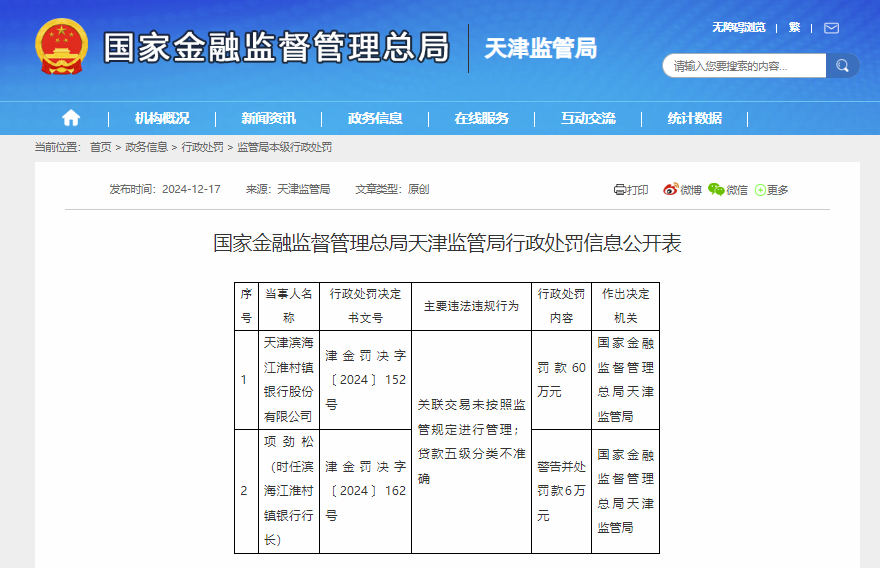 天津滨海江淮村镇银行股份有限公司因关联交易未按照监管规定进行管理;贷款五级分类不准确,被处以罚款60万元,同时,该行时任行长项劲松也被处以警告并罚款6万元。