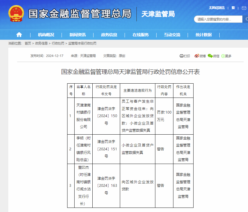 天津津南村镇银行股份有限公司因员工与客户存在非正常资金往来、向区域外企业发放贷款;小微企业及首贷户监管数据失真等违法违规行为,被处以津金罚决字〔2024〕150号行政处罚决定书,罚款100万元。同时,该行时任风险总监李明因小微企业及首贷户监管数据失真被警告,咸水沽支行行长董印杰则因违规向区域外企业发放贷款被警告。