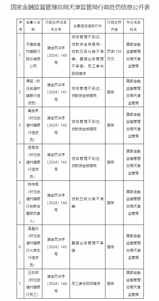 天津武清村镇银行股份有限公司因贷后管理不到位、贷款资金被挪用;贷款五级分类不准确;票据业务管理不审慎以及员工参与民间借贷等违法违规行为,被处以罚款150万元,同时,时任信贷员谭超、崔金亮、屈恩泽因贷后管理不到位,贷款资金被挪用被警告,而时任创新发展部负责人陈传阁因贷款五级分类不准确被警告,时任大良支行信贷员孟晨光因票据业务管理不审慎被警告,时任员工王东民则因参与民间借贷被警告。