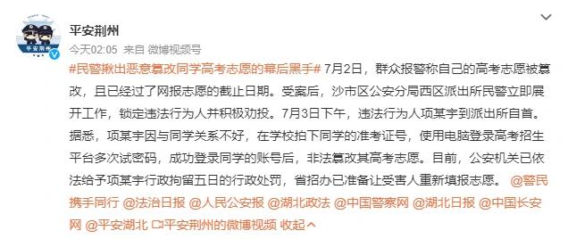 据湖北省荆州市公安局官方微博5日消息,7月2日,群众报警称自己的高考志愿被篡改,且已经过了网报志愿的截止日期。受案后,沙市区公安分局西区派出所民警立即展开工作,锁定违法行为人并积极劝投。