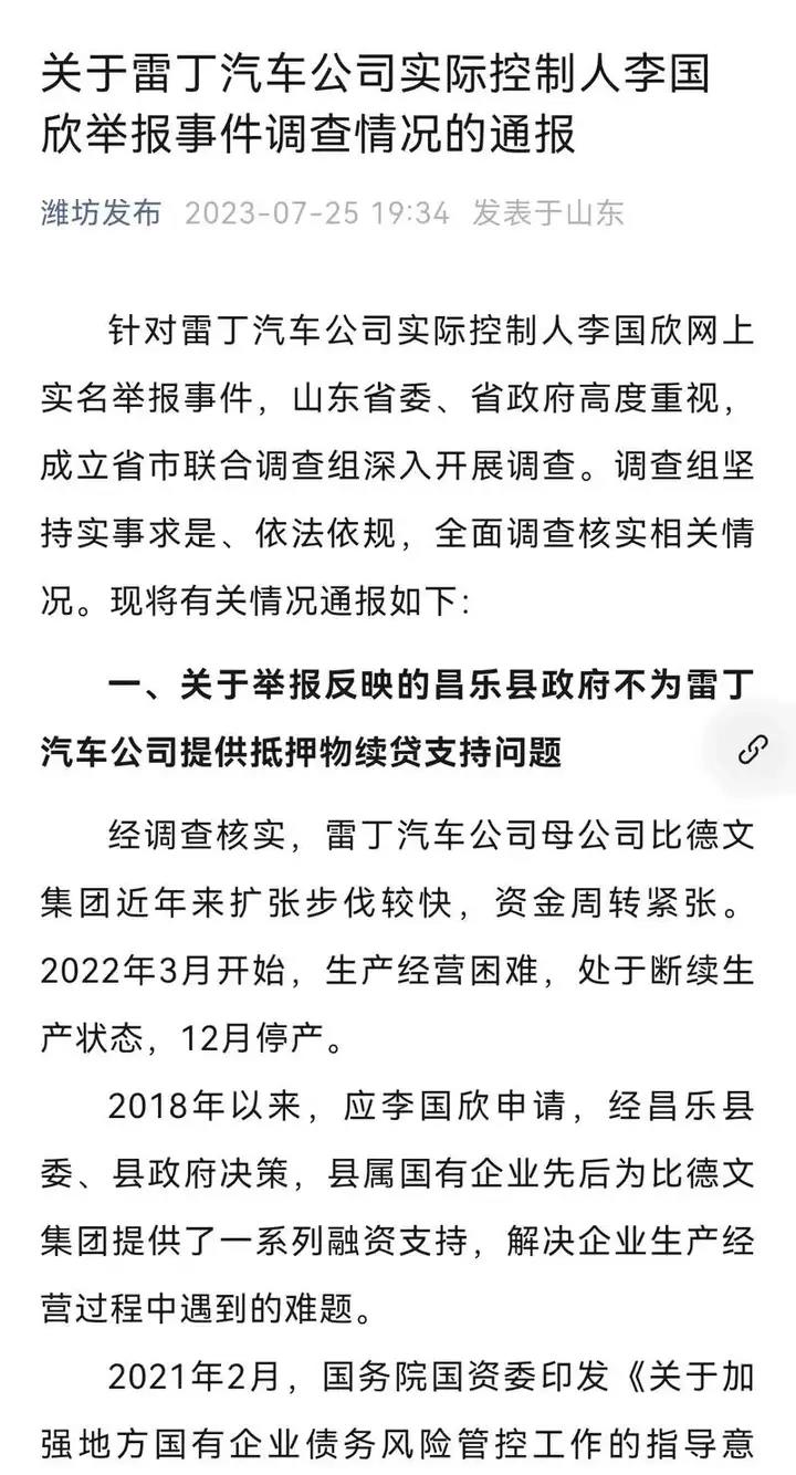 通报称,关于举报反映的昌乐县政府不为雷丁汽车公司提供抵押物续贷支持问题,经调查核实,雷丁汽车公司母公司比德文集团近年来扩张步伐较快,资金周转紧张。2022年3月开始,生产经营困难,处于断续生产状态,12月停产。2018年以来,应李国欣申请,经昌乐县委、县政府决策,县属国有企业先后为比德文集团提供了一系列融资支持,解决企业生产经营过程中遇到的难题。2021年2月,国务院国资委印发《关于加强地方国有企业债务风险管控工作的指导意见》,规定地方国有企业原则上不对无产权关系的企业提供担保。2022年10月以后,雷丁汽车公司两次向昌乐县政府申请,要求继续为其提供担保。鉴于再对该企业进行融资支持不符合国家和省市有关规定,昌乐县政府综合研判后,没有满足其申请。调查认定,县政府该决定符合规定。