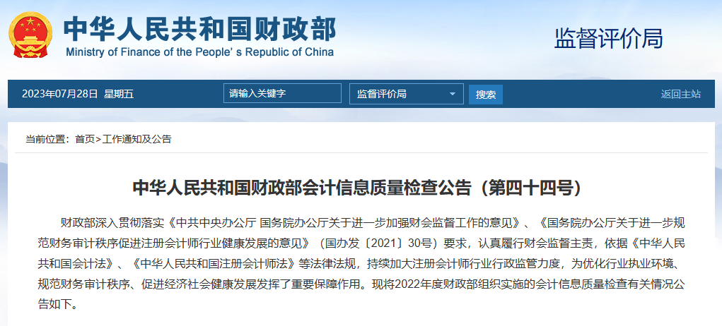 财政部网站7月28日发布的《中华人民共和国财政部会计信息质量检查公告》显示,2023年以来,财政部依法对5家会计师事务所、19名注册会计师、7户企业及1名企业主要负责人作出行政处罚。