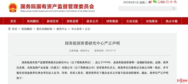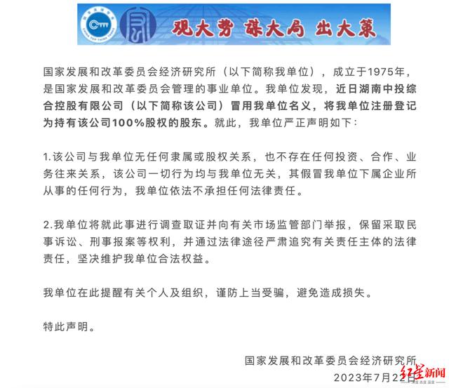 7月22日,国家发展和改革委员会经济研究所通过公众号“国宏高端智库”打假,表示与湖南中投综合控股有限公司无任何关系。而在两天前,7月20日,中央部委下属单位国务院国资委也在公众号发表声明称,央资监理产业发展(内蒙古)有限公司冒用国务院国资委研究中心名义,将国务院国资委注册登记为其公司唯一股东。