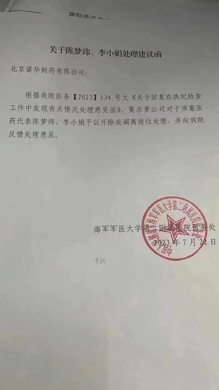就在7日晚间,网传图片显示,近日海军军医大学第二附属医院(又名“上海长征医院”)分别向上海诺华贸易有限公司和北京诺华制药有限公司发送处理建议函。处理建议函中写明,长征医院根据《关于回复在执纪检查工作中发现有关情况处理意见函》,要求上述两家公司分别对涉案医药代表徐胜利、孟婷婷,陈梦玮、李小娟予以开除或调离岗位处理,并且向该院反馈处理意见。