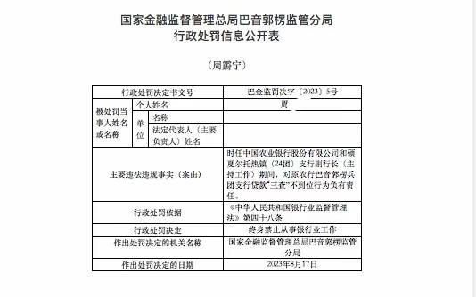 近日,国家金融监督管理总局巴音郭楞监管分局公布一则行政处罚决定书。决定书显示,时任中国农业银行股份有限公司和硕夏尔托热镇(24团)支行(下称二十四团农行)副行长(主持工作)期间,周某宁对原农行巴音郭楞兵团支行贷款“三查”不到位行为负有责任,被罚终身禁止从事银行业工作。