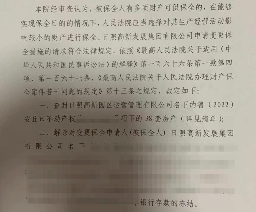 6月20日,日照中院作出裁定,解除对高新集团名下银行账户亿元资金的冻结,查封前述房产证名下的38套房产。值得注意的是,安丘市为山东省省辖县级市、由潍坊市代管。