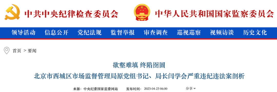 2022年12月23日,距人民法院以贪污罪、受贿罪对西城区市场监督管理局原党组书记、局长闫学会作出判决刚过去3天,北京市西城区便召开了“以案为鉴 以案促改”警示教育大会,会上播放的警示教育片披露,闫学会因未能顺利晋升二级巡视员而大为恼火、牢骚满腹,常常向身边人发泄对组织的强烈不满,抱怨组织“对干部的关心关爱一点都没有”。