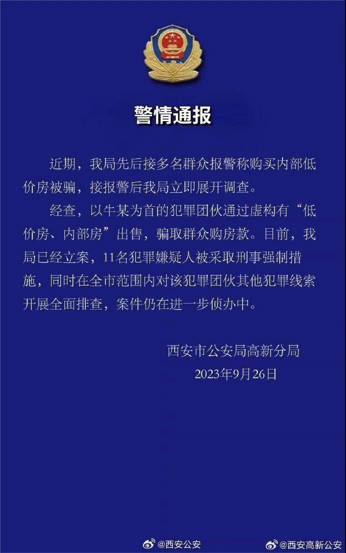 据@西安公安 消息,近期,我局先后接多名群众报警称购买内部低价房被骗,接报警后我局立即展开调查。