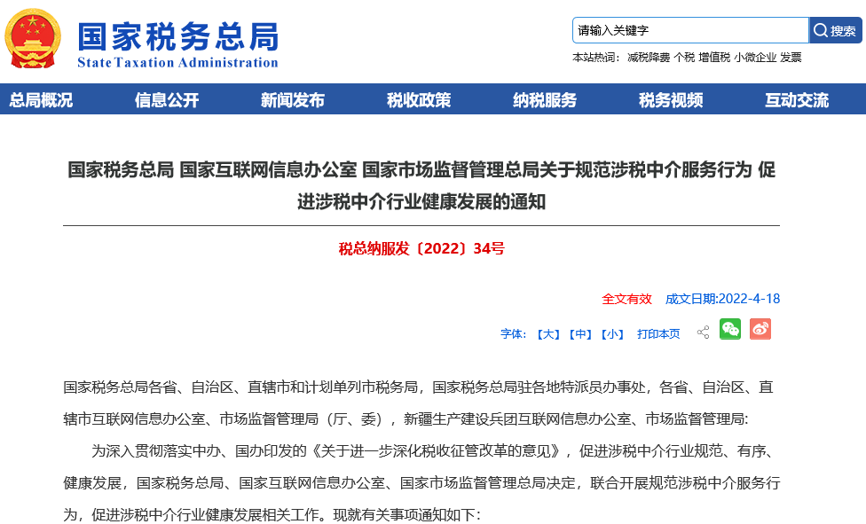 国家税务总局、国家互联网信息办公室、国家市场监督管理总局三部门联合发布最新公告: