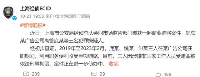 10月21日,靴子落地。上海市公安局经济犯罪侦查总队官方微博发布微博,证实并通报了此案。经初步查证,2019年至2023年2月,底某、姚某、洪某三人在某广告公司任职期间,利用职务便利收受巨额贿赂。