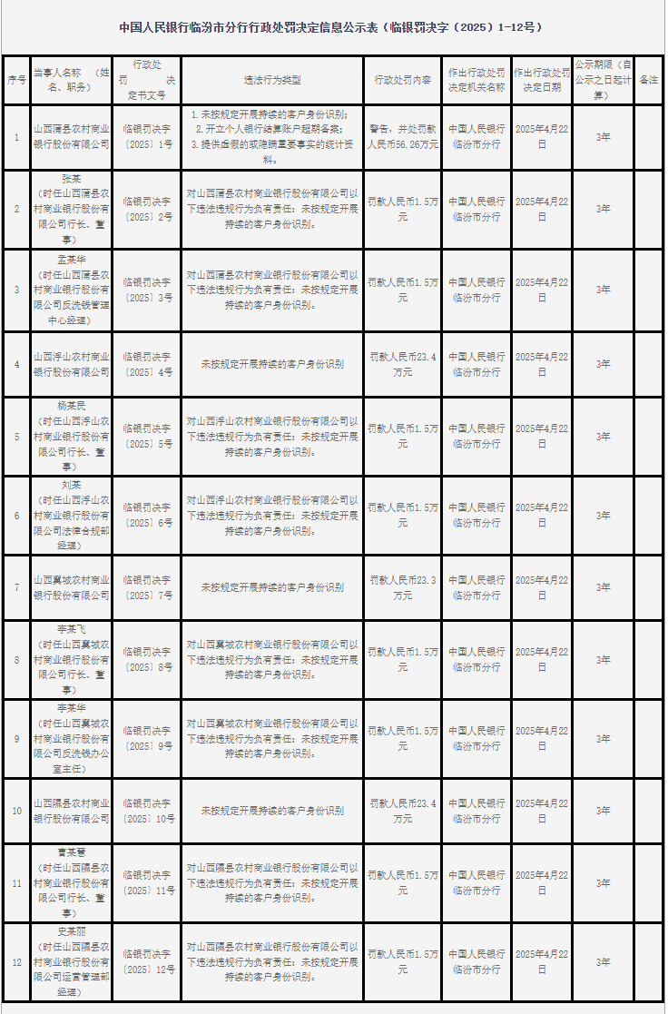 近期,中国人民银行山西分行,连续开出多张罚单,此次处罚主要集中在临汾市分行和运城市分行所管辖的多家农商行及多位相关责任人,罚金数额累计达360.528万元,其中最大单笔罚金达115.868万元,这些银行的违法行为主要集中在客户身份识别、资料报送、现金业务、网络安全保护四个方面。