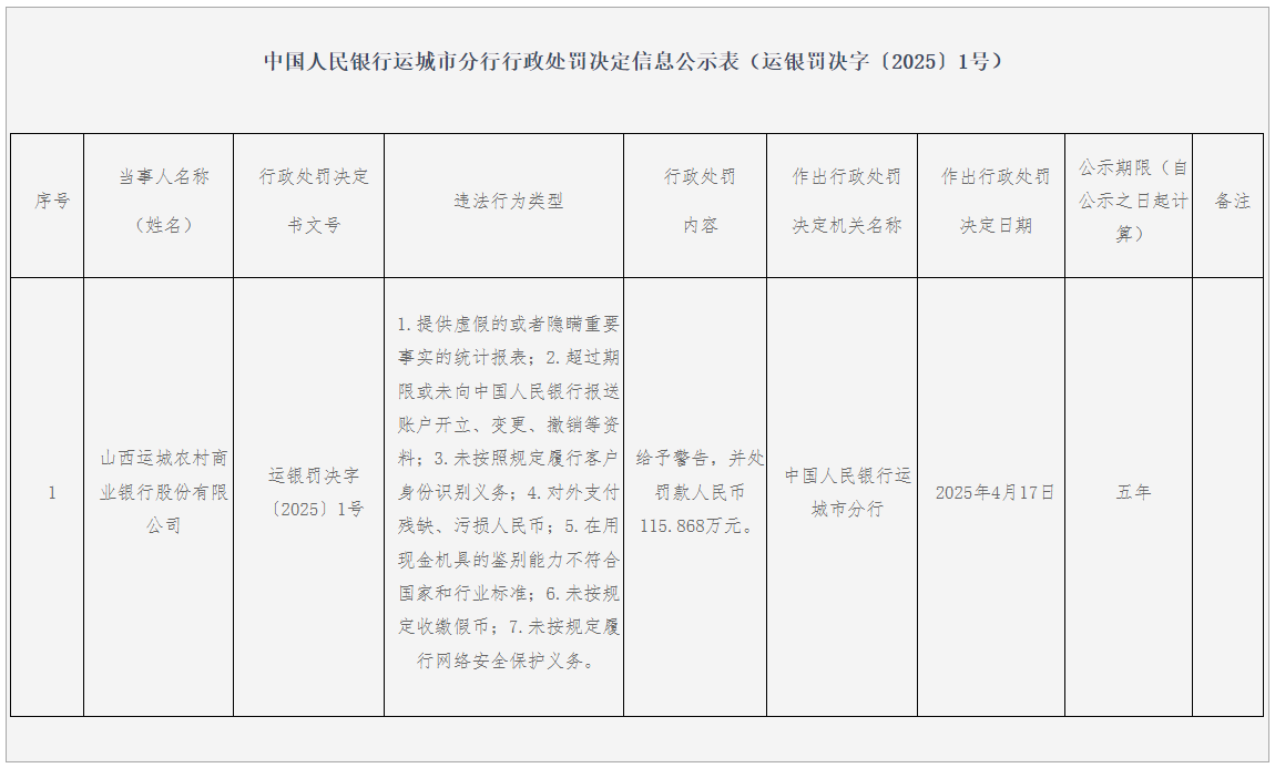 网络安全违规方面,山西运城农商行未按规定履行网络安全保护义务,在数字化金融快速发展的当下,银行网络安全关乎客户个人信息和资金安全。