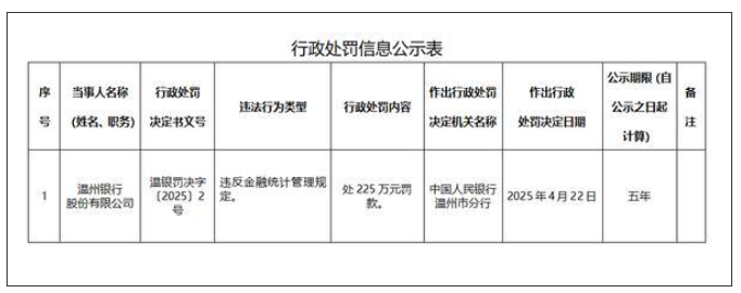 近日,中国人民银行温州市分行行政处罚信息公示表显示,温州银行股份有限公司因违反金融统计管理规定,被罚款225万元。