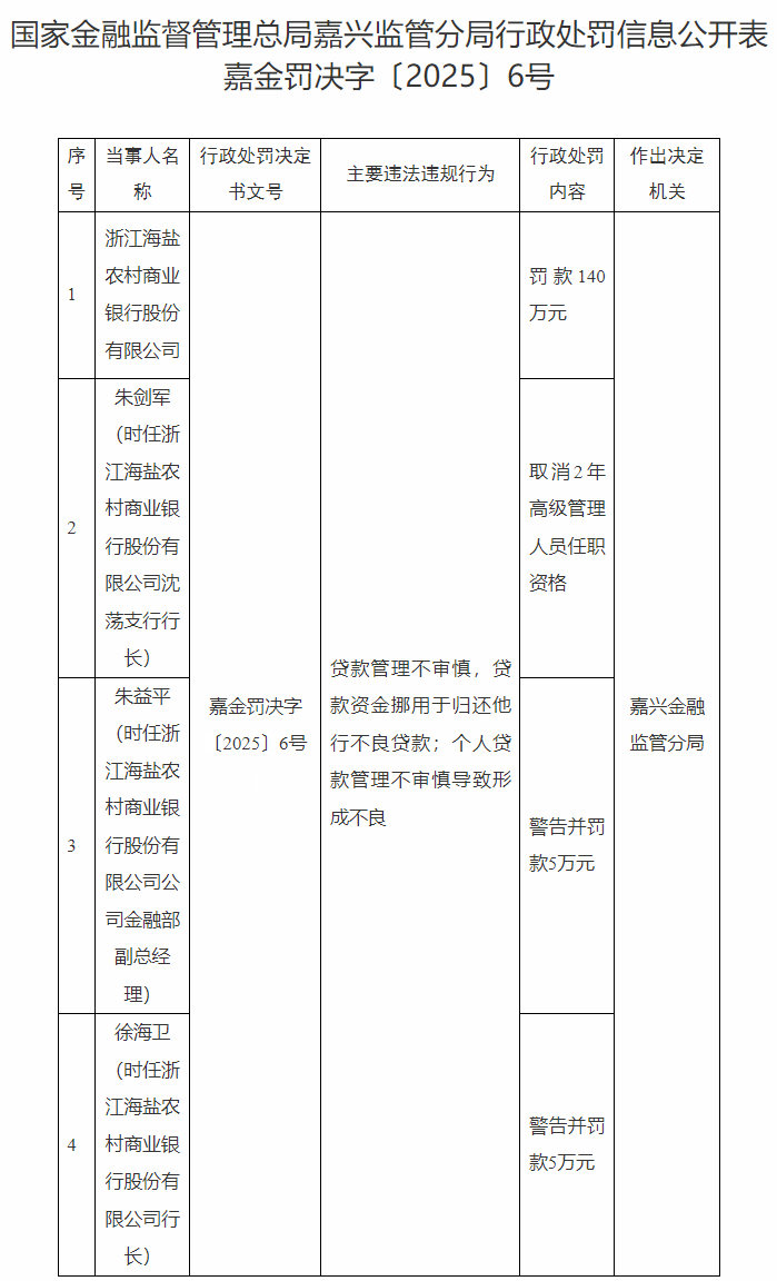 7月2日,国家金融监管总局嘉兴监管分局披露的行政处罚信息显示,浙江海盐农商银行因存在贷款管理不审慎、贷款资金被挪用于归还他行不良贷款、个人贷款管理不审慎导致形成不良等问题,被处以140万元罚款。