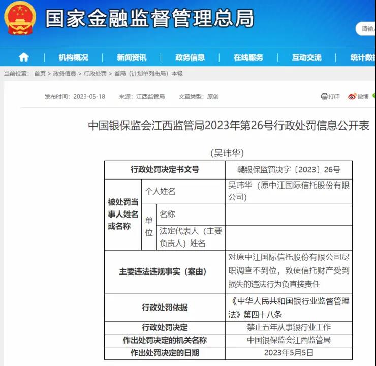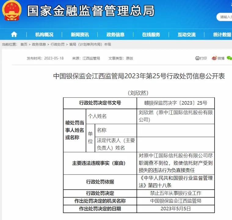 5月18日,江西银保监局两张罚单显示,对原中江国际信托股份有限公司两名责任人进行处罚。