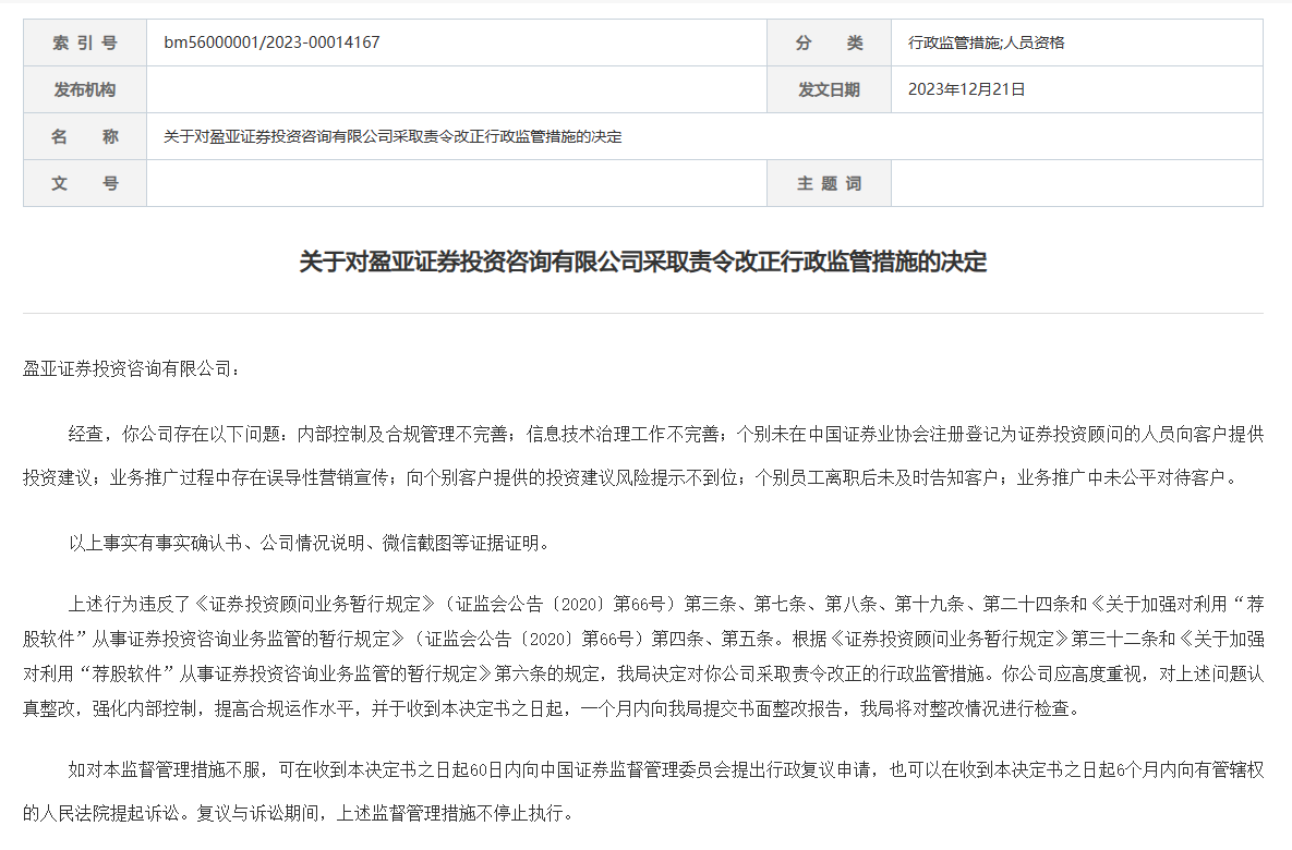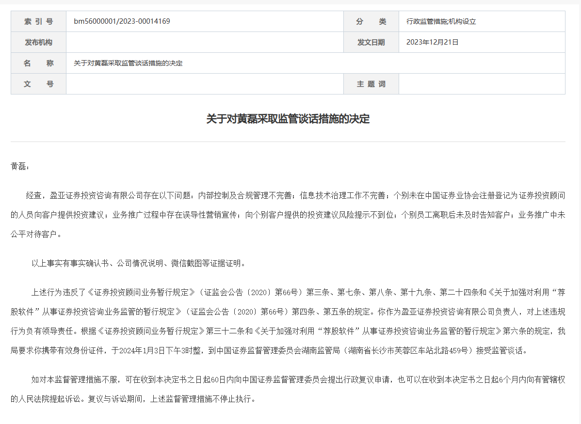 同日,湖南证监局还披露了关于对黄磊采取监管谈话措施的决定,湖南证监局表示,上述行为违反了规定,黄磊作为盈亚证券投资咨询有限公司负责人,对上述违规行为负有领导责任。湖南证监局要求黄磊到中国证券监督管理委员会湖南监管局接受监管谈话。