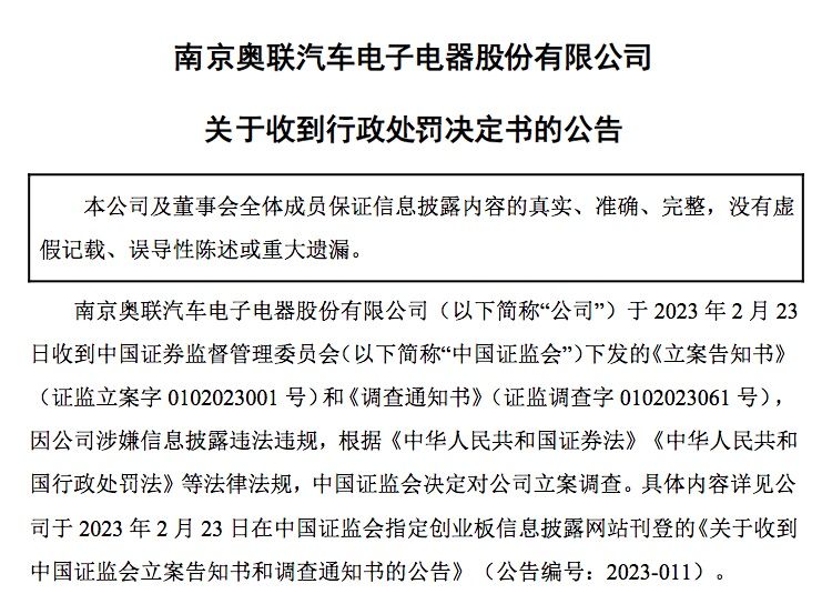 奥联电子(300585)4月7日晚间公告,该公司于近日收到中国证监会下发的《行政处罚决定书》,中国证监会认为,奥联电子构成信息披露违法行为,依据《证券法》相关规定,中国证监会决定对奥联电子责令改正,给予警告,并处以300万元罚款。对奥联电子时任董事长陈光水等相关人员给予警告并处罚款。