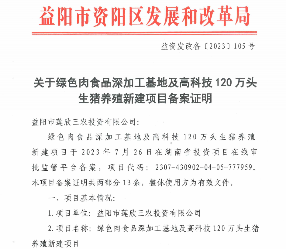 项目总投资44.8亿元,全部由项目单位自筹。项目单位是益阳市莲欣三农投资有限公司,项目名称为绿色肉食品深加工基地及高科技120万头生猪养殖新建项目,建设地点在益阳市资阳区迎风桥镇新花园村。