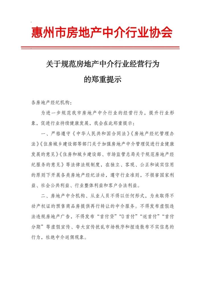 5月28日晚,南方日报、南方+记者从惠州市房地产中介行业协会获悉,为规范全市房地产中介行业经营行为,提升行业形象,协会正式发布《关于规范房地产中介行业经营行为的郑重提示》(以下简称《提示》),要求行业企业及从业人员严格遵守行业准则,规范开展各类房地产经纪活动,不得发布虚假广告信息扰乱市场秩序。